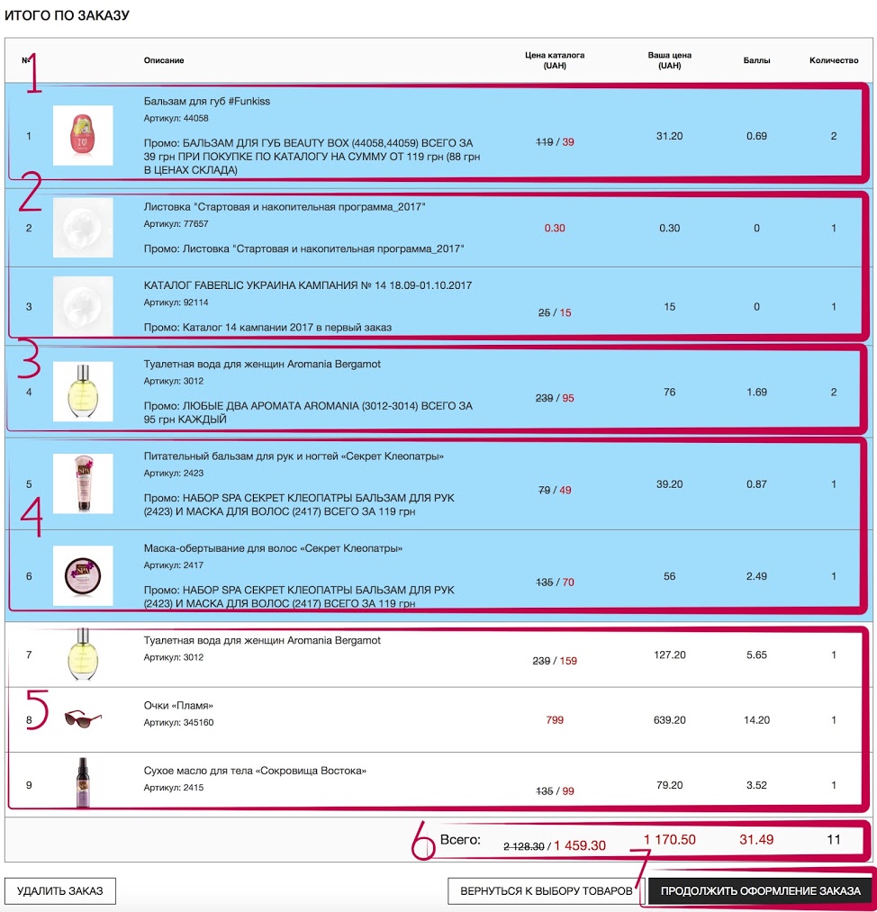 6 - итоговая строка нашего заказа. Красная цена - цена каталога, вторая колонка наша цена, и третья - наши баллы! Самая последняя цифра - количество товаров в нашем заказе!